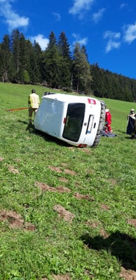 Ein Fahrzeug war über eine Wegkante hinausgeraten und stürzte sich mehrmals überschlagend ab bzw. blieb dann auf der Fahrerseite liegen.