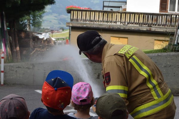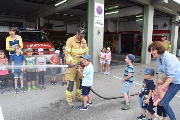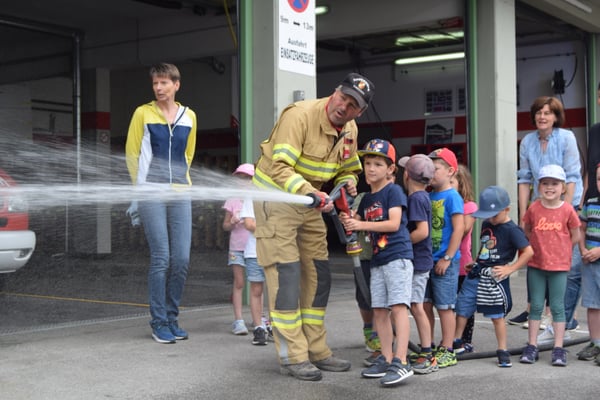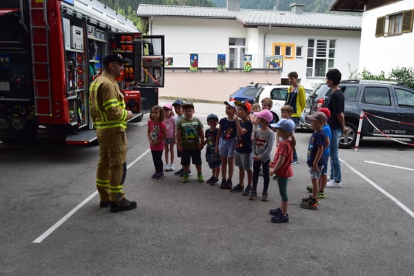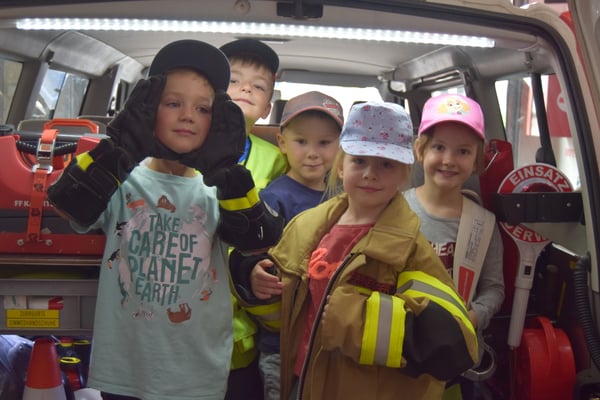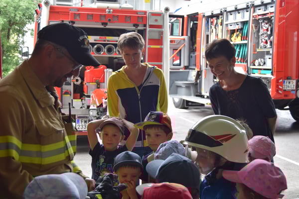 Die Kinder und Betreuer wurden von den Mitgliedern der Feuerwehr abgeholt und sogleich wurden die Fahrzeuge erklärt und begutachtet.
