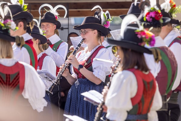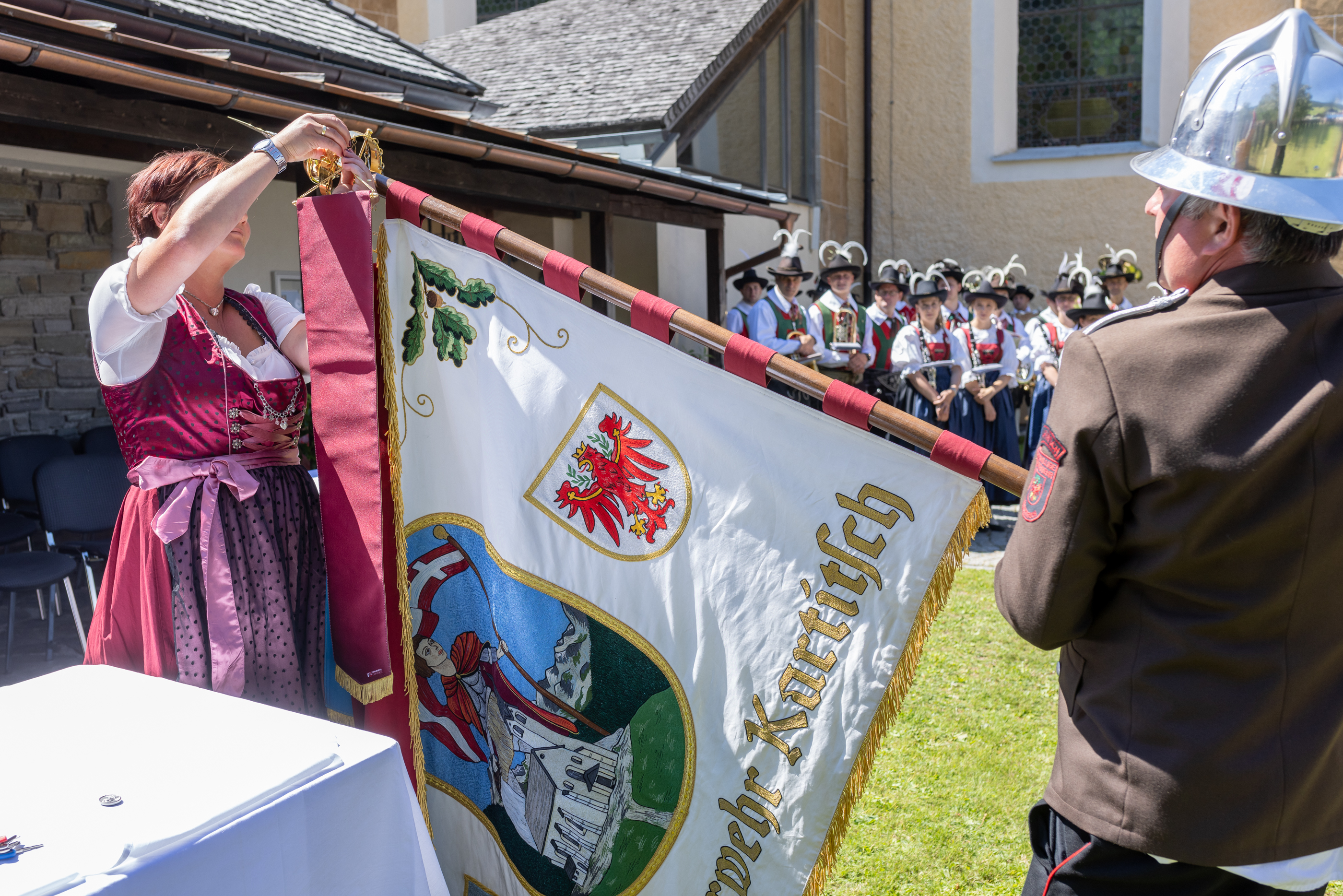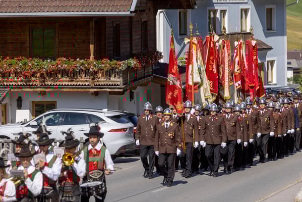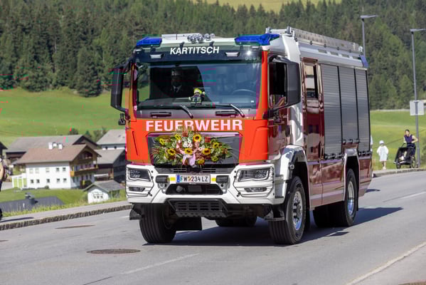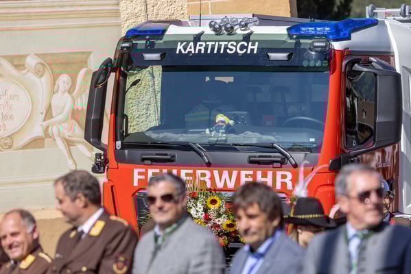 Nach der Aufstellung und Meldung an den Bezirkskommandanten OBR Draxl Harald marschierten die BMK Kartitsch, die Abordnungen der Feuerwehren, die Feuerwehr Kartitsch sowie das neue Fahrzeug zum Festplatz.