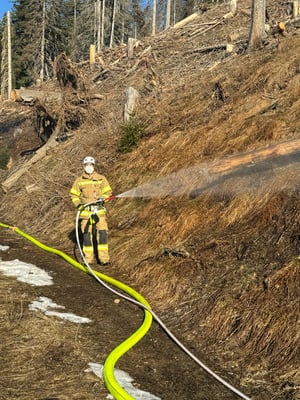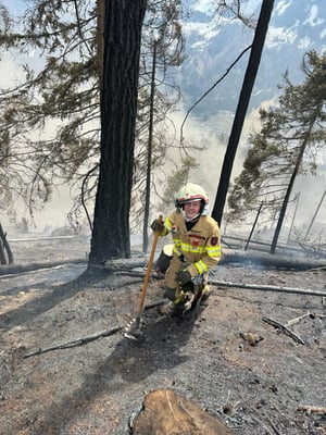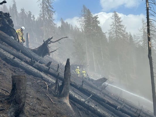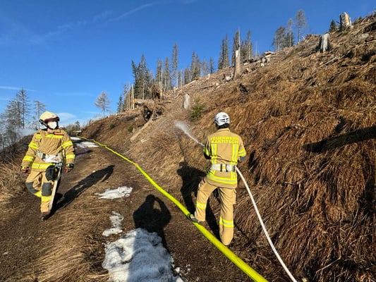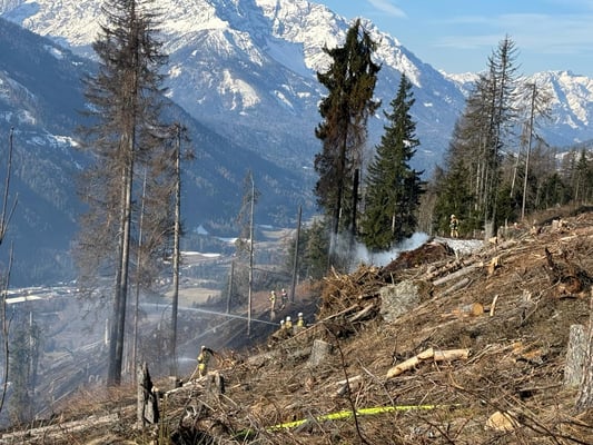 Vor Ort waren dann den ganzen Tag über im teils sehr steilen Gelände Glutnester abzulöschen und die weitere Brandausbreitung zu verhindern.
