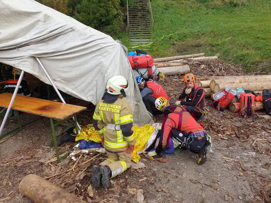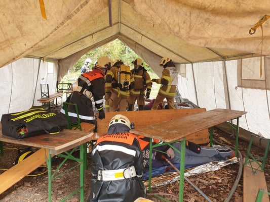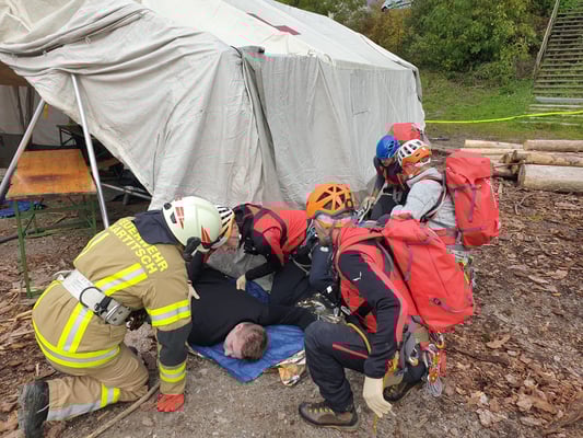 Die Übungsszenarien umfassten ein eingestürztes Festzelt, einen Verkehrsunfall und gleichzeitig wurde von der Bergrettung noch ein Sucheinsatz mit anschließender Personenbergung gestartet.