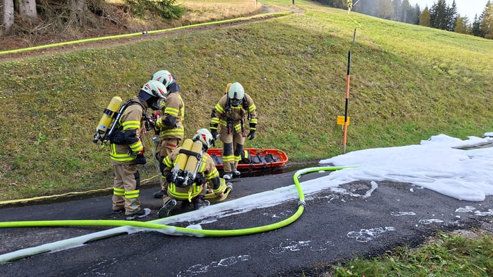 Mit dem TLFA und Atemschutz wurde sofort ein Schaumangriff gestartet um das auslaufende Benzin vor einer Entzündung zu bewahren.