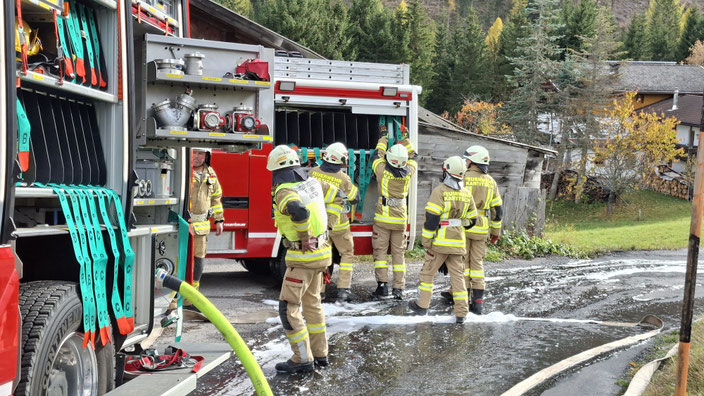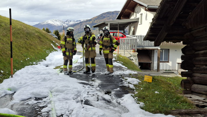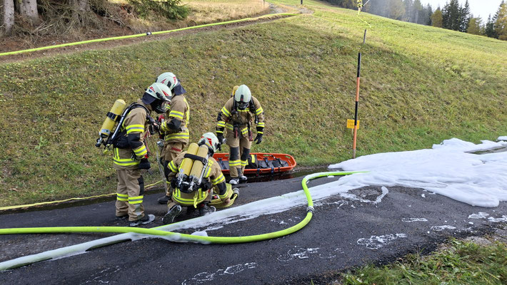 Mit dem TLFA und Atemschutz wurde sofort ein Schaumangriff gestartet um das auslaufende Benzin vor einer Entzündung zu bewahren.